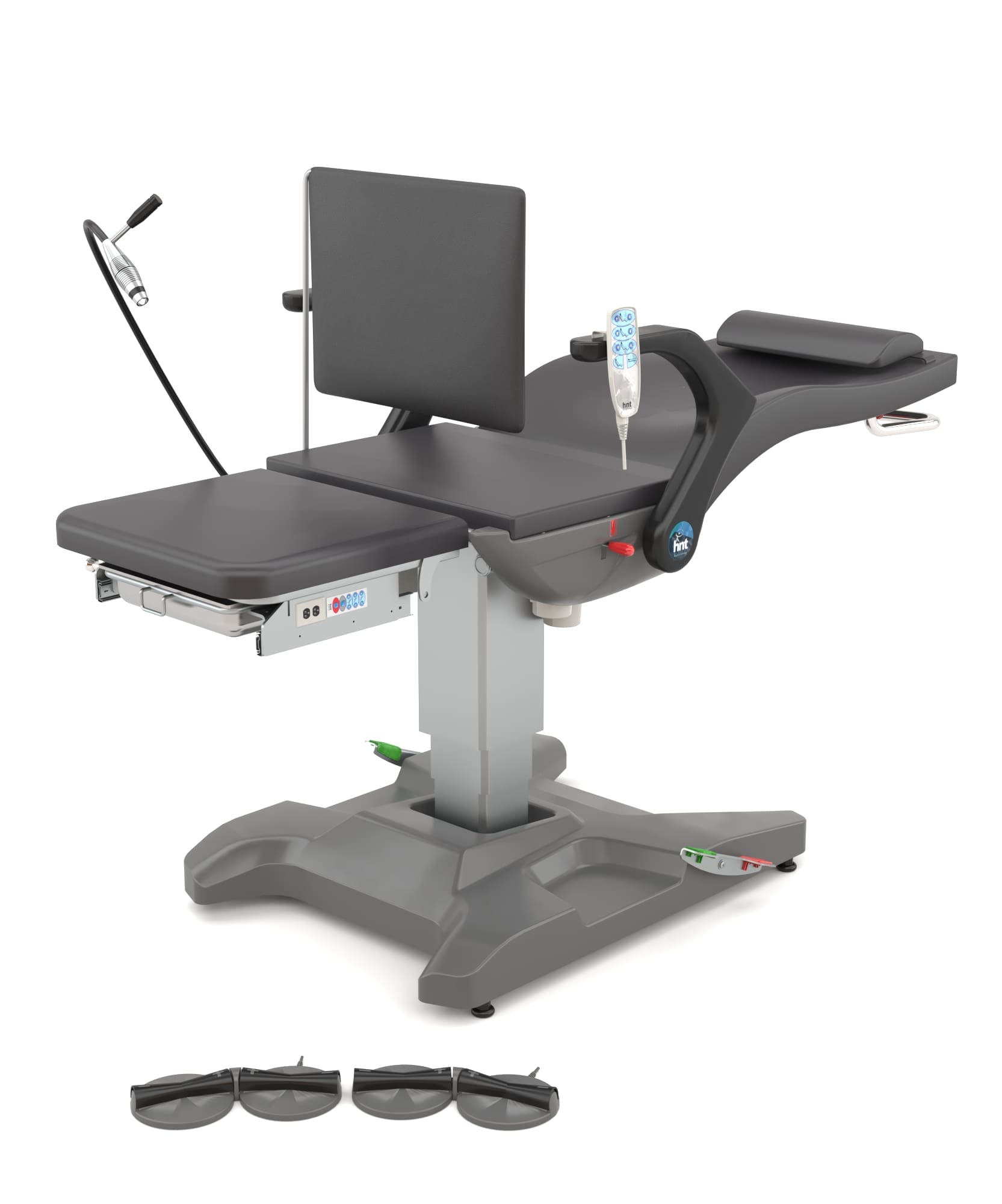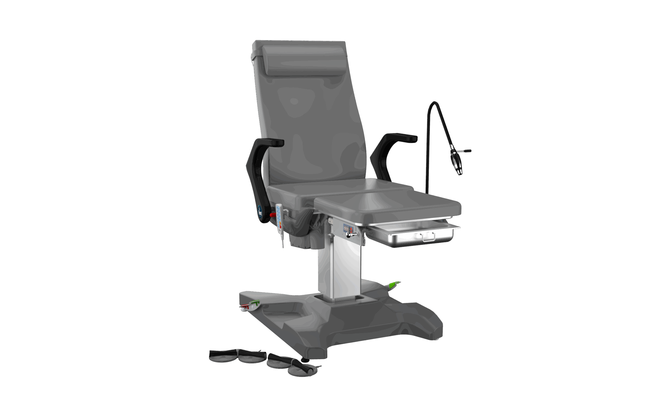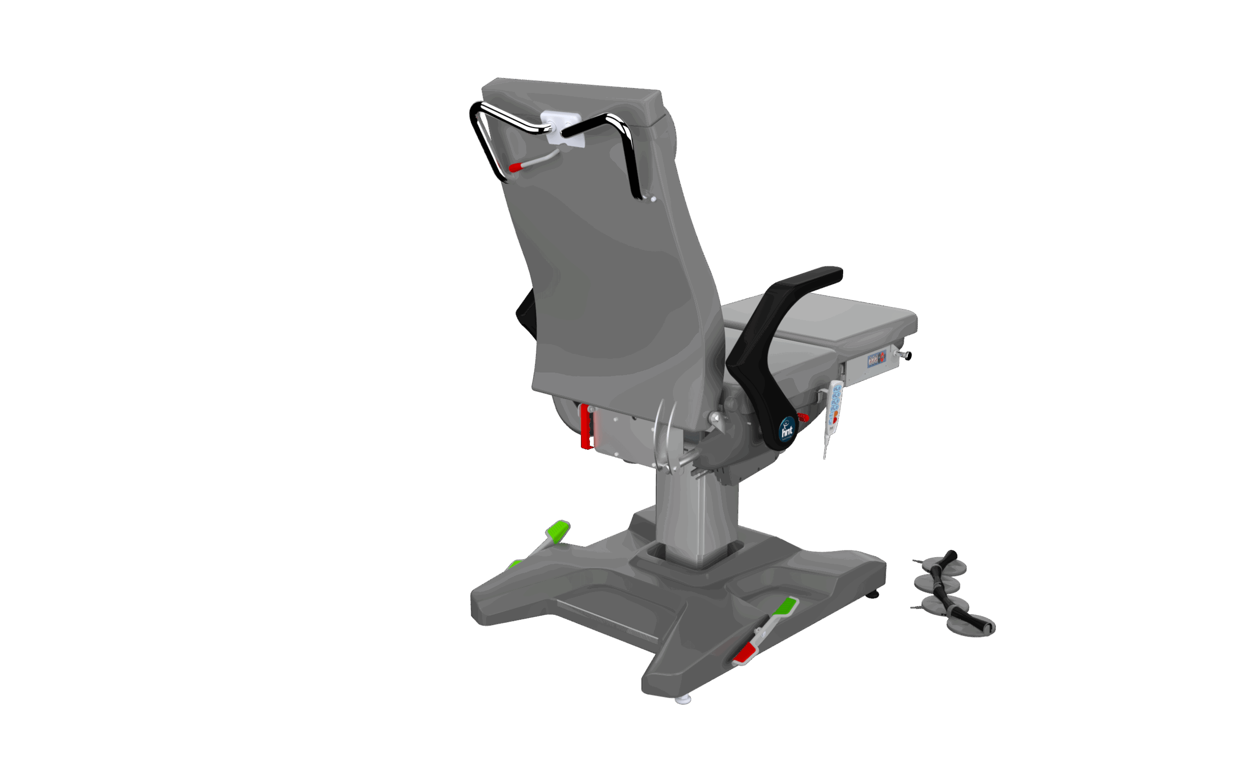 Тип: ортопедическое кресло с мотором Регулировка высоты: минимальная — 1280 мм, максимальная — 1780 мм (минимальная посадочная часть — 570 мм, максимальная — 1070 мм) Размер спинки: длина 800 мм, ширина 550 мм Размер сиденья: длина 440 мм, ширина 600 мм Размер подножки: длина 445 мм, ширина 500 мм Регулировка угла наклона спинки: с электродвигателем, 0–66° Регулировка по Тренделенбургу: с электродвигателем, 0–13° Система управления движениями: дистанционное управление; регулировка высоты сиденья, спинки, ног, Тренделенбурга и разгибания ног осуществляется с помощью пульта Угол наклона стопы: с электродвигателем, 0–50° Аксессуары: IV-стойка из нержавеющей стали; подушка покрыта материалом Vinlex; сиденье снабжено 5-сантиметровой подушкой Visco для комфорта; ножная секция выдвигается до 20 см в зависимости от роста пациента; подлокотники регулируются вправо, влево и вверх–вниз; подвижные части изготовлены из нержавеющей стали Регулировка по высоте: вверх–вниз Подлокотники: 355×425×65 мм; материал — Vinlex, металлический лист ABS и алюминиевое соединение IV-стойка: металлическая, толщина 1,5 мм, один крючок Ручка: расположена сзади, нержавеющая сталь Ø25 мм Каркас: профиль 30×40×3 мм, 20×40×2 мм, 20×30×2 мм; трубный профиль Ø25×2 мм; металлический каркас 5, 6 и 8 мм; материал — углеродистая сталь; покрытие — электростатическая порошковая краска с антикоррозийной защитой Обивка и поверхности: боковые и сидячие подушки покрыты антибактериальным материалом Vinlex Ролики: Ø50 мм; импортные — Tente, Steinco, Blickle, Rhombus (4 шт.); отечественные — Kama, Kozmo, Emes (4 шт.) Количество двигателей: 4 двигателя — регулировка высоты (2000 Н), спинки (3500 Н), подножки (6000 Н), Тренделенбурга (6000 Н) Дополнительные характеристики: система предотвращения проскальзывания с электроприводом; центральный замок педального типа на 4 колеса; аккумулятор в комплекте; опционально — компактные кронштейны и цифровые весы; платформа для поддержки ног с патентом и дополнительным отсеком; синхронизированная работа опорной платформы и модуля хранения; неподвижные нижние ножки рамы проходят под сиденьем; педаль управления нижним колесным механизмом; вращение кресла на 90° вправо и влево; быстрая реакция на экстренные ситуации с помощью привода механического типа до положения искусственного дыхания.