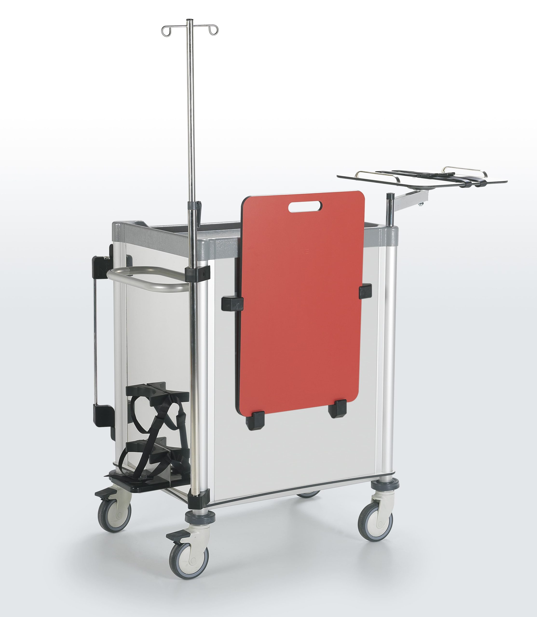 Мобильный столик для дефибрилляторов с ремнями безопасности сверху.